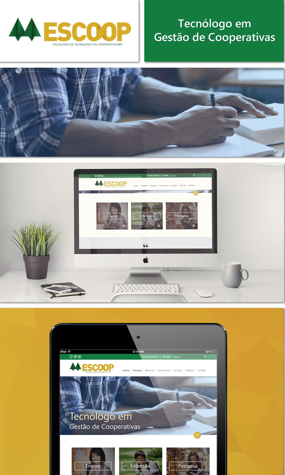 O novo website criado para a Escoop é dinâmico e apresenta de forma eficiente o acesso à informação. Com seu design moderno e responsivo, traz a atualização de multiplataforma. A navegabilidade também foi melhorada, visando promover uma melhor integração entre aluno, professor e comunidade.